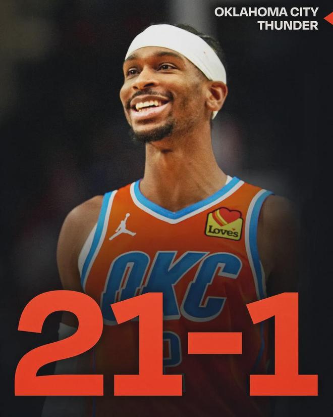 雷霆作为卫冕冠军,本赛季更加不可阻挡,迄今为止以21胜1负傲视群雄。