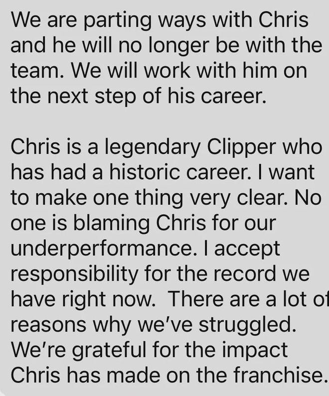 快船篮球总裁弗兰克发表声明:“我们与克里斯-保罗分道扬镳,他不再是团队的一员,快船队将协助他规划职业生涯的下一步。”保罗的合同到12月15日才能交易,看快船的声明,并没有裁掉保罗,而是接下来要交易他。