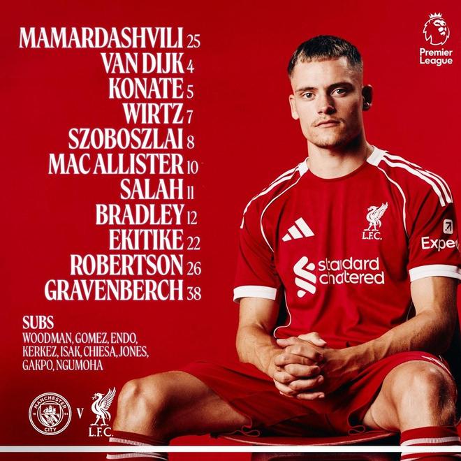 利物浦首发:25-马马尔达什维利、26-罗伯逊、4-范戴克、5-科纳特、12-康纳-布拉德利、10-麦卡利斯特、38-赫拉芬贝赫、8-索博斯洛伊、11-萨拉赫、7-维尔茨、22-埃基蒂克